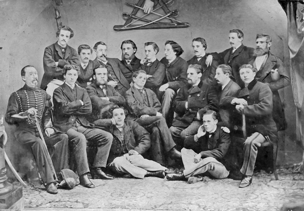De Arnhemse schermvereniging Mars in 1883. Geheel links hoogstwaarschijnlijk sergeant Thomas Klinkspoor, in hetzelfde jaar betrokken bij de oprichting van de eerste cricketclub in de stad. (Bron: Gelders Archief, fotonummer 1583-13935, fotograaf onbekend).