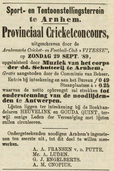 Terug naar Muliers publicatie Cricket, dat de vroegste cricketgeschiedenis van Nederland schetst. Over Vitesse schrijft hij nog dat er aanvankelijk dertig werkende leden zijn (“later zelfs 80”) en dat het cricketspel wordt gespeeld “op den Boulevard, later te Velp en eindelijk op het sportterrein.” Het laatstgenoemde Sport- en Tentoonstellingsterrein aan de Velperweg bestaat al sinds augustus 1887 (zie kadertekst), maar wordt waarschijnlijk pas twee jaar later voor het eerst door Vitesse gebruikt. Dit gebeurt tijdens een door de club uitgeschreven provinciaal cricketconcours ten bate van slachtoffers van een ramp bij het Belgische Antwerpen: bij een ontploffing van een munitiefabriek komen daar op 6 september 1889 tientallen mensen om het leven en zijn er veel gewonden. Nog die maand, op zondag 29 september, wordt het concours georganiseerd.[xx]