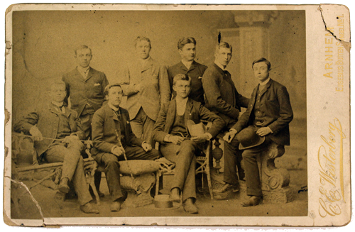 Eindexamenklas van het Stedelijk Gymnasium in Arnhem 1889. Jonkheer Dirk Jan de Geer staat tweede van links. (Bron: Nationaal Archief, archief De Geer, bloknr. 2.21.236, inv.nr. 20, fotograaf C.E. Westerborg)