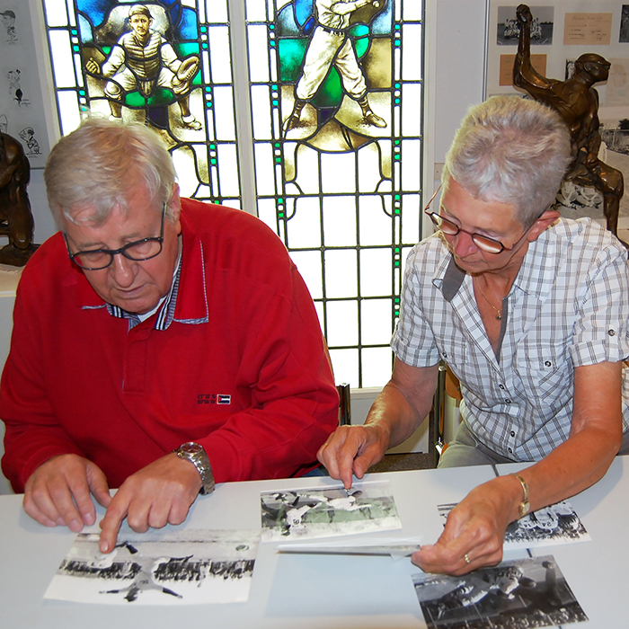 Karel van Veen en Elly Nijhuis van het Honkbal en Softbal Museum bekijken de nieuwe aanwinsten. Foto: Gerard van den Houten