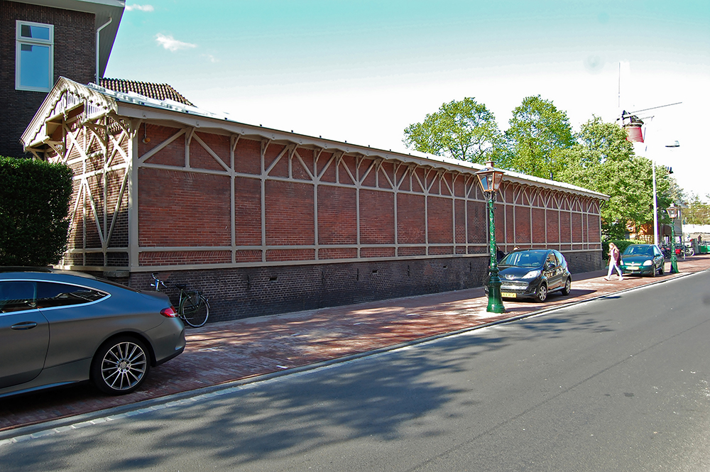 Onder de tweede regel van deze drie gevels is één laag bakstenen met de kopse kanten schuin in de gevel geplaatst. De bovenste gevelgeleding bestaat deels uit diagonaal geplaatste stijlen (schoren). De uitkragingen van de kap rusten op bewerkte schoren. De boeiboorden zijn verlevendigd met houten diamantkoppen (imitatie-klinknagels). De sierspanten (hammerbeamconstructie) aan de kopgevels zijn door middel van gesneden schoren met de gevel verbonden. De transparante westelijke langsgevel is eveneens voorzien van enig vakwerk, maar is voor het grootste deel ingevuld met glasdeuren, vensterpartijen en een over de gehele gevellengte doorgetrokken reeks bovenramen. Alleen onder de vensters en in de geveltoppen bevindt zich metselwerk, waarvan de bovenste laag baksteen onder de vensters met de kopse kanten schuin in de gevel is geplaatst. Alle gevelopeningen zijn voorzien van houten kozijnen met afgeschuinde neggen en bewerkte bovenhoeken. De gevel telt drie ingangsrisalieten met dwarskap (middenrisaliet) en steekkappen. Deze zijn voorzien van een uitkragend sierspant met hammerbeamconstructie als die aan de kopgevels.