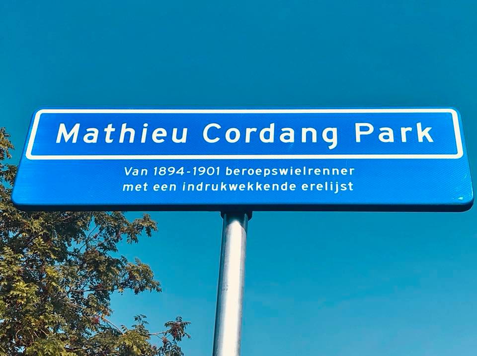 Ruim anderhalf jaar geleden heeft er een grote reconstructie aan de groenvoorziening plaatsgevonden. De verwilderde begroeiing is verwijderd, een nieuwe border is aangelegd, bomen en struiken zijn verwijderd en opnieuw geplant. Hierdoor is de groenvoorziening getransformeerd tot een park en is naamgeving van het park wel passend. Op 26 december 1869 werd Mathieu Cordang in Blerick geboren. Als negende telg uit een schippersgezin met vijftien kinderen moest Cordang al op jonge leeftijd aan het werk. Hij werd zeeman en voer de wereld rond. Toen zijn schip in 1893 in Vlissingen lag, nam hij deel aan een wielerkoers. Hij won op een geleende fiets de koers en besloot wielrenner te worden. Hij zocht een baan aan wal en in de eerste instantie werd hij gangmaker van bekende coureurs. Toen in 1895 aan Nederlandse renners werd toegestaan om als professional uit te komen, maakte Cordang van de wielersport zijn beroep. In zijn wielercarrière fietste hij een indrukwekkende erelijst bij elkaar. Rond de eeuwwisseling stonden alle denkbare records op zijn naam. In Frankrijk kreeg hij onder meer de erenaam “Le Vaillant”, de onverschrokkene.