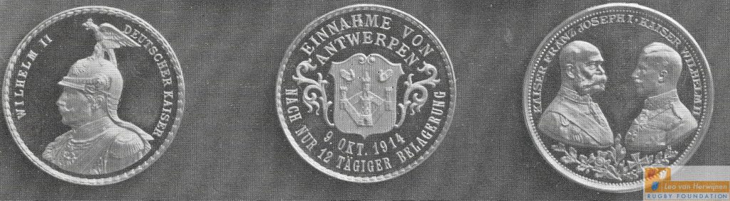 De Duitse Pers liet de wereld, maar zeker ook het thuisfront weten, welke enorme veroveringen men maakte. Buiten schitterende foto’s met uitdagende Duitse militairen in Antwerpen werden er nog diezelfde triomfmaand twee prachtige herdenkingsmunten uitgebracht. Op de beide munten “Einnahme von Antwerpen 9 oktober 1914 ( kruis) en op de beide exemplaren keuze uit de kop van de Duitse Keizer Wilhelm II of met Wilhelm II en de Oostenrijkse Keizer Frans Joseph I.